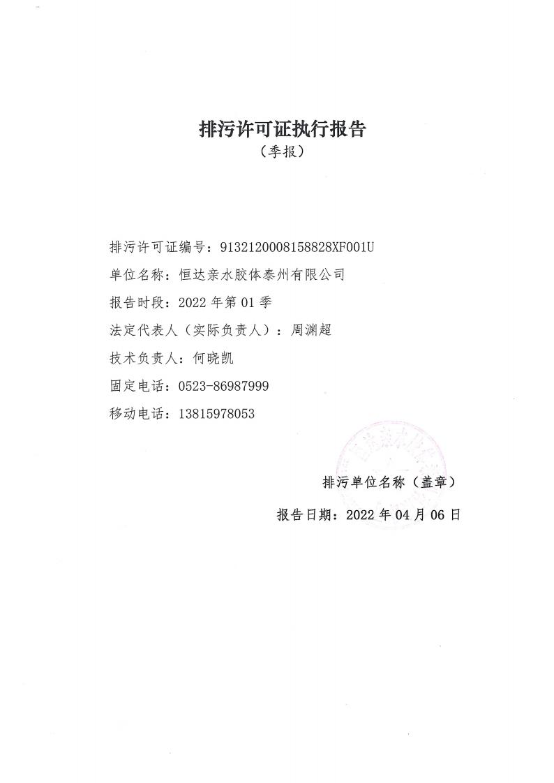 恒達(dá)親水膠體泰州有限公司-2022年第一季度排污許可證執(zhí)行報(bào)告