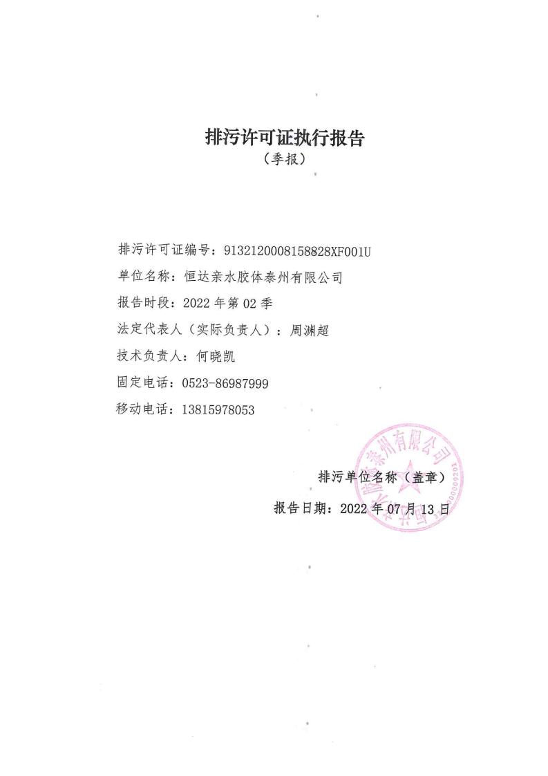 恒達(dá)親水膠體泰州有限公司-2022年第二季度排污許可證執(zhí)行報(bào)告
