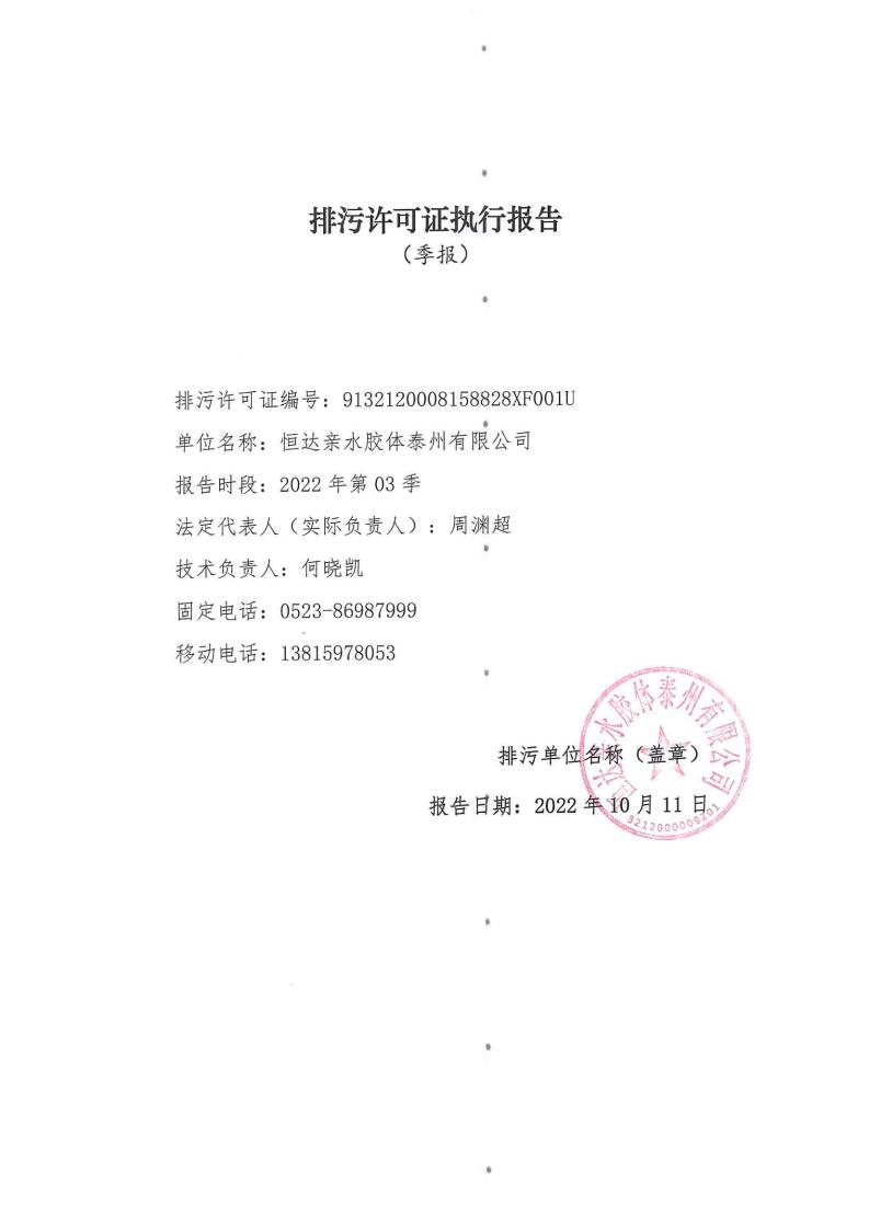 恒達(dá)親水膠體泰州有限公司-2022年第三季度排污許可證執(zhí)行報(bào)告