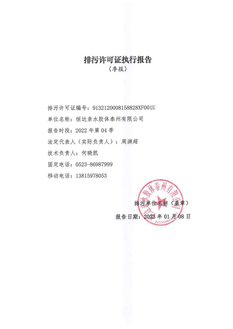 恒達(dá)親水膠體泰州有限公司-2022年第四季度排污許可證執(zhí)行報(bào)告