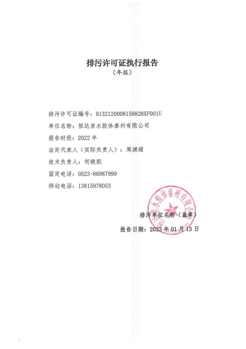 恒達(dá)親水膠體泰州有限公司-2022年年度排污許可證執(zhí)行報(bào)告